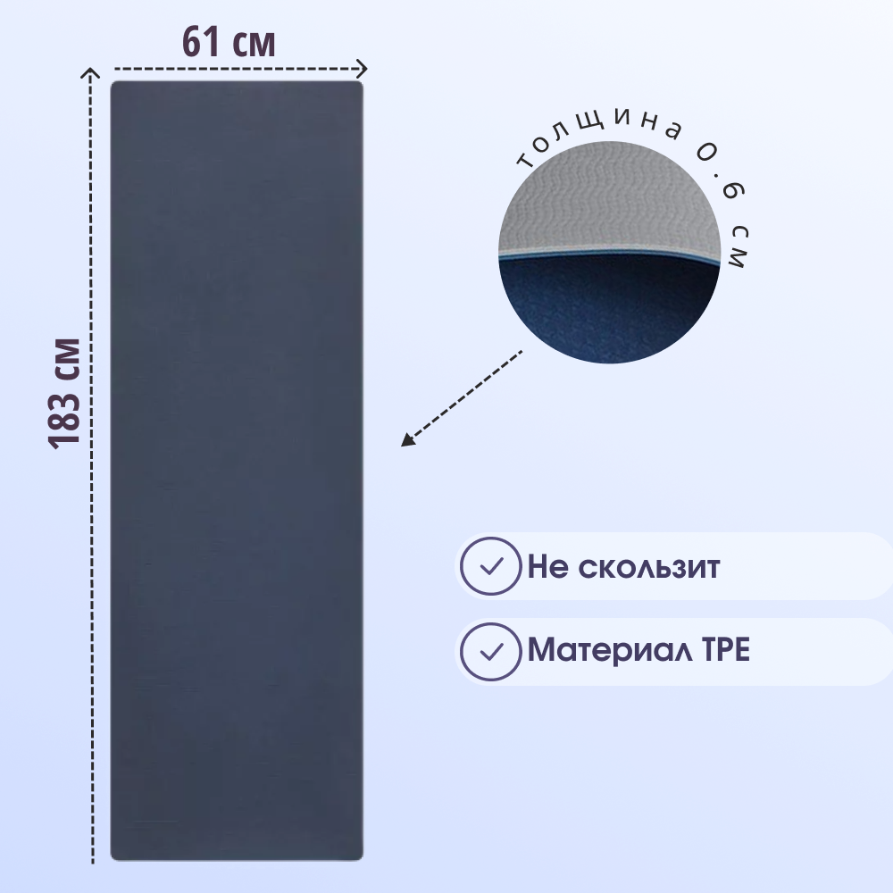 Коврик для йоги и фитнеса Yoga Island, нескользящий, ТПЕ, 0.6 см, 183×61 см, темно-синий информация:
