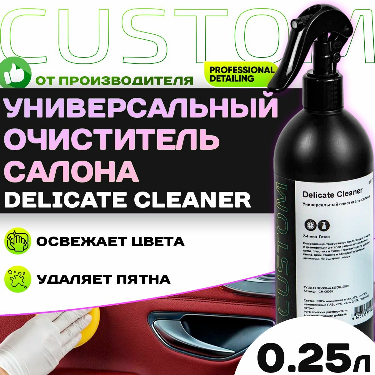 Универсальный очиститель салона - химчистка салона, удалитель пятен CUSTOM Delicate Cleaner Vinet, 250 мл информация: