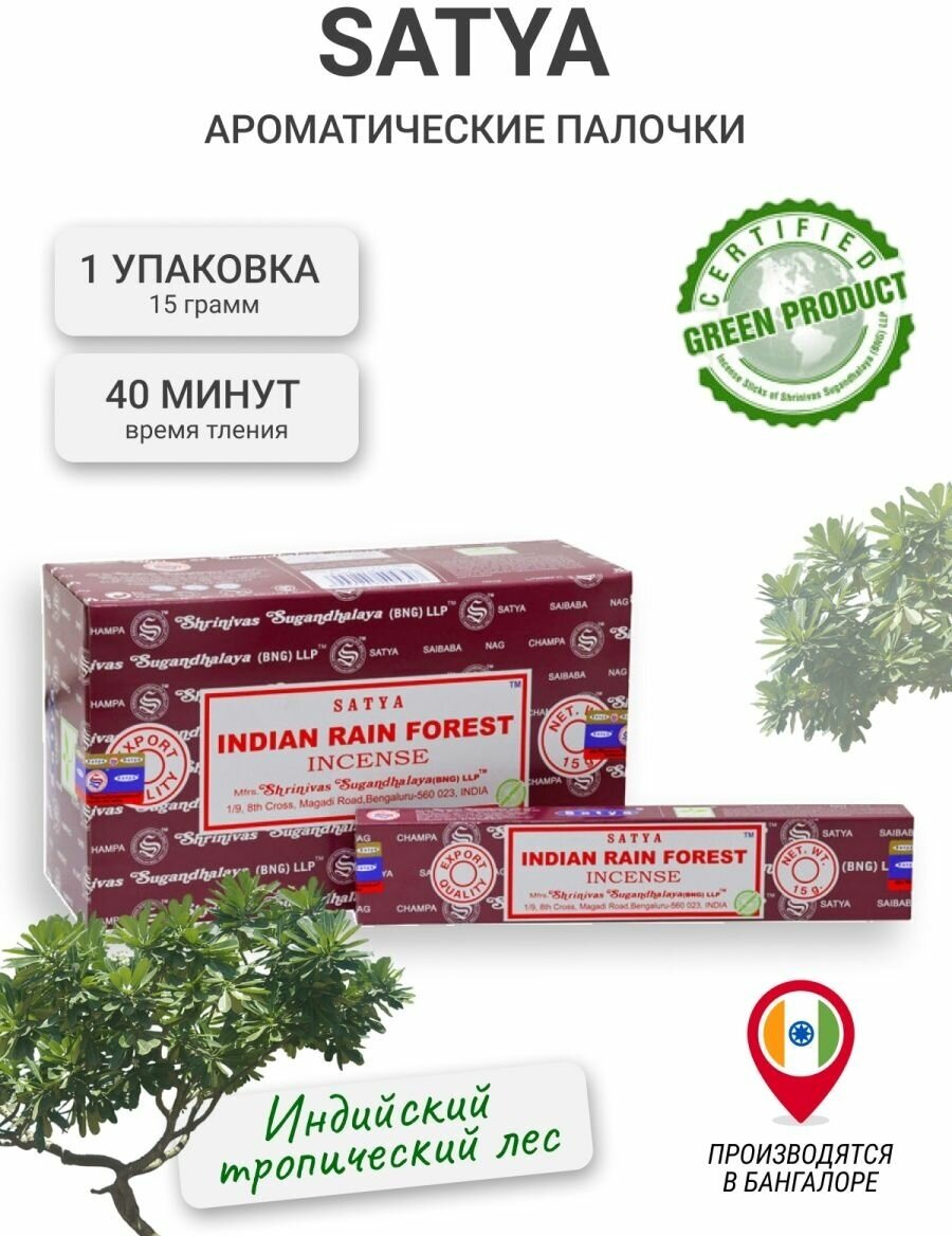 Благовония Indian Rain Forest Incense (Индийский тропический лес) Ароматические индийские палочки для дома, йоги и медитации, Satya (Сатья), 15г информация: