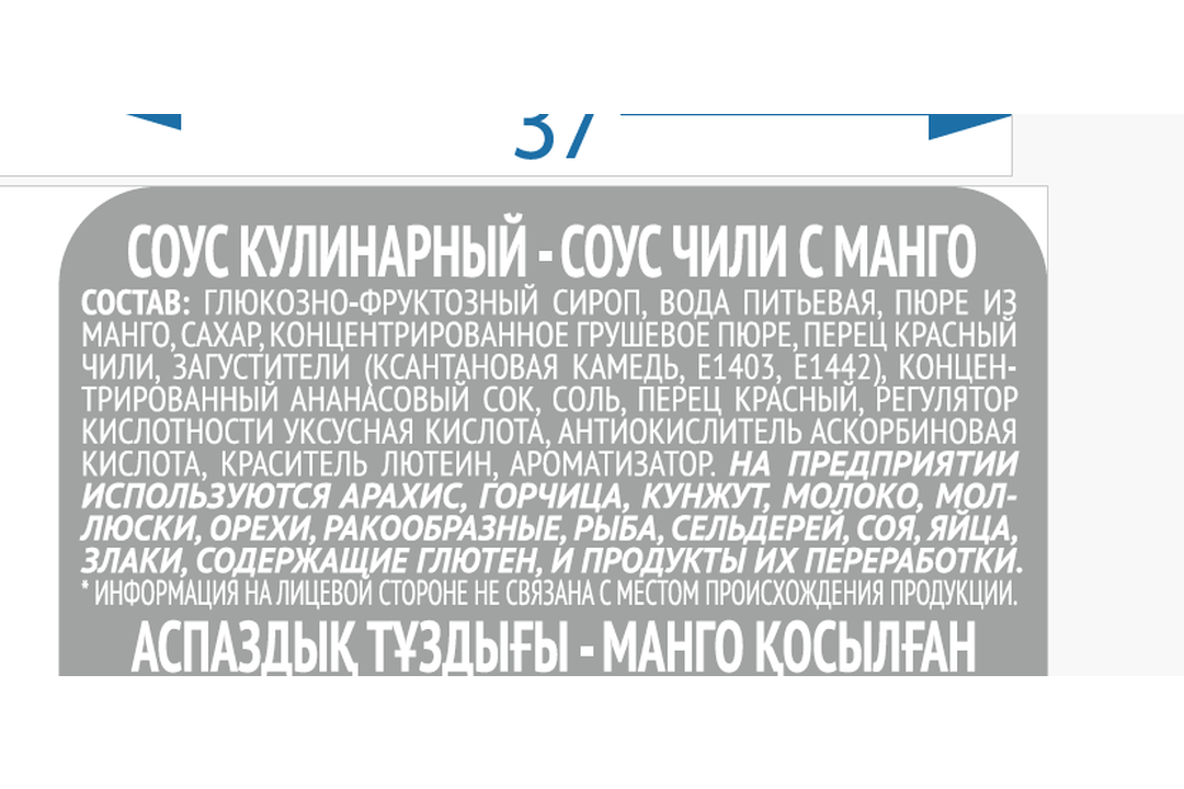 | Состав | глюкозно-фруктозный сироп, вода питьевая, пюре из манго, сахар, концентрированное грушевое пюре, перец красный чили, загустители (ксантановая камедь, Е1403, Е1442), концентрированный ананасовый сок, соль, перец красный, регулятор кислотности уксусная кислота, антиокислитель аскорбиновая кислота, краситель лютеин, ароматизатор |