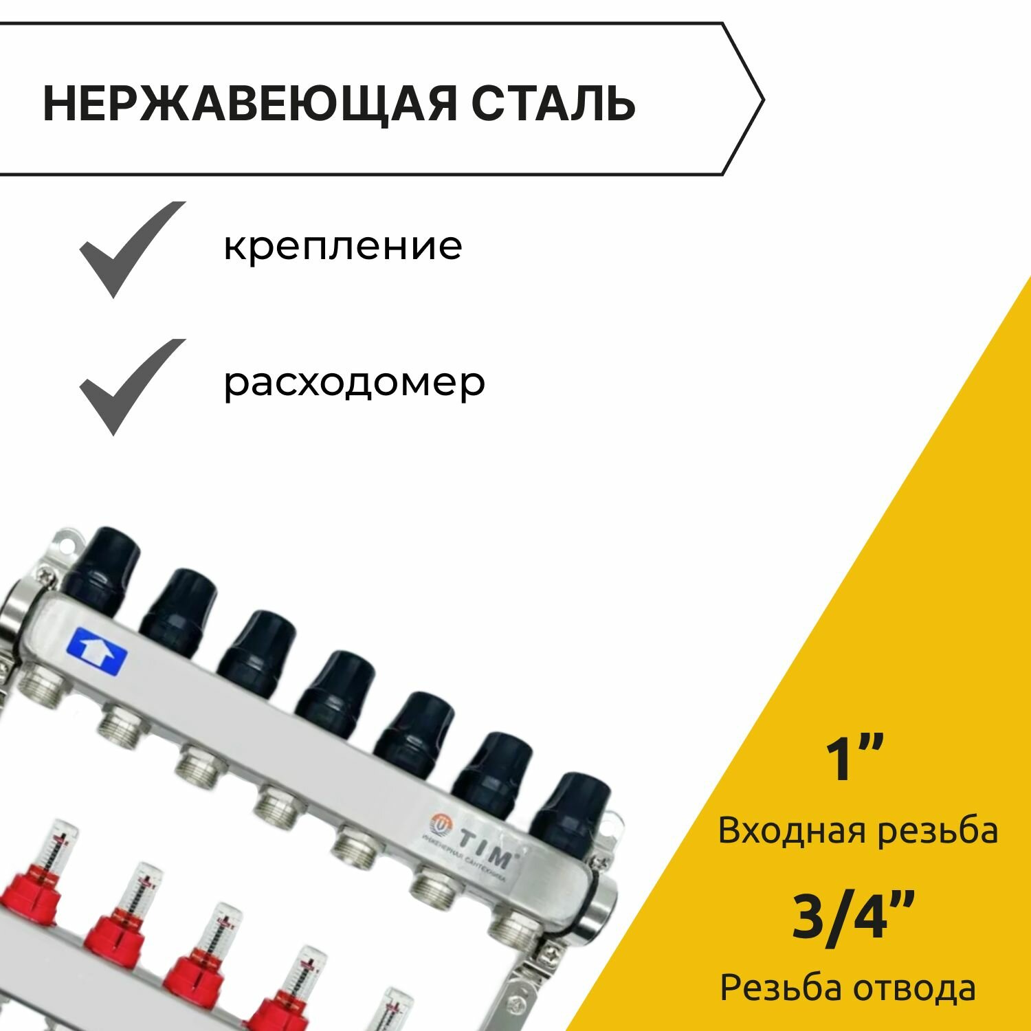 Коллектор с расходомерами из нержавеющей стали для теплого пола 1", 7 выходов 3/4 TIM KDS5007