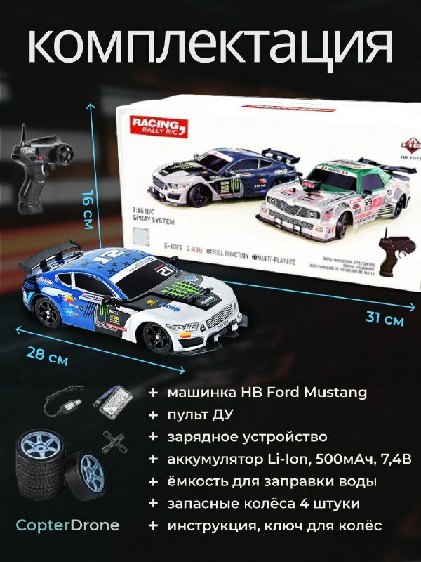 10 цен на Радиоуправляемая машина для дрифта HB Ford Mustang (4WD, свет, пар, акб, 1:16) - SC16A05-1 (SC16A05-1)