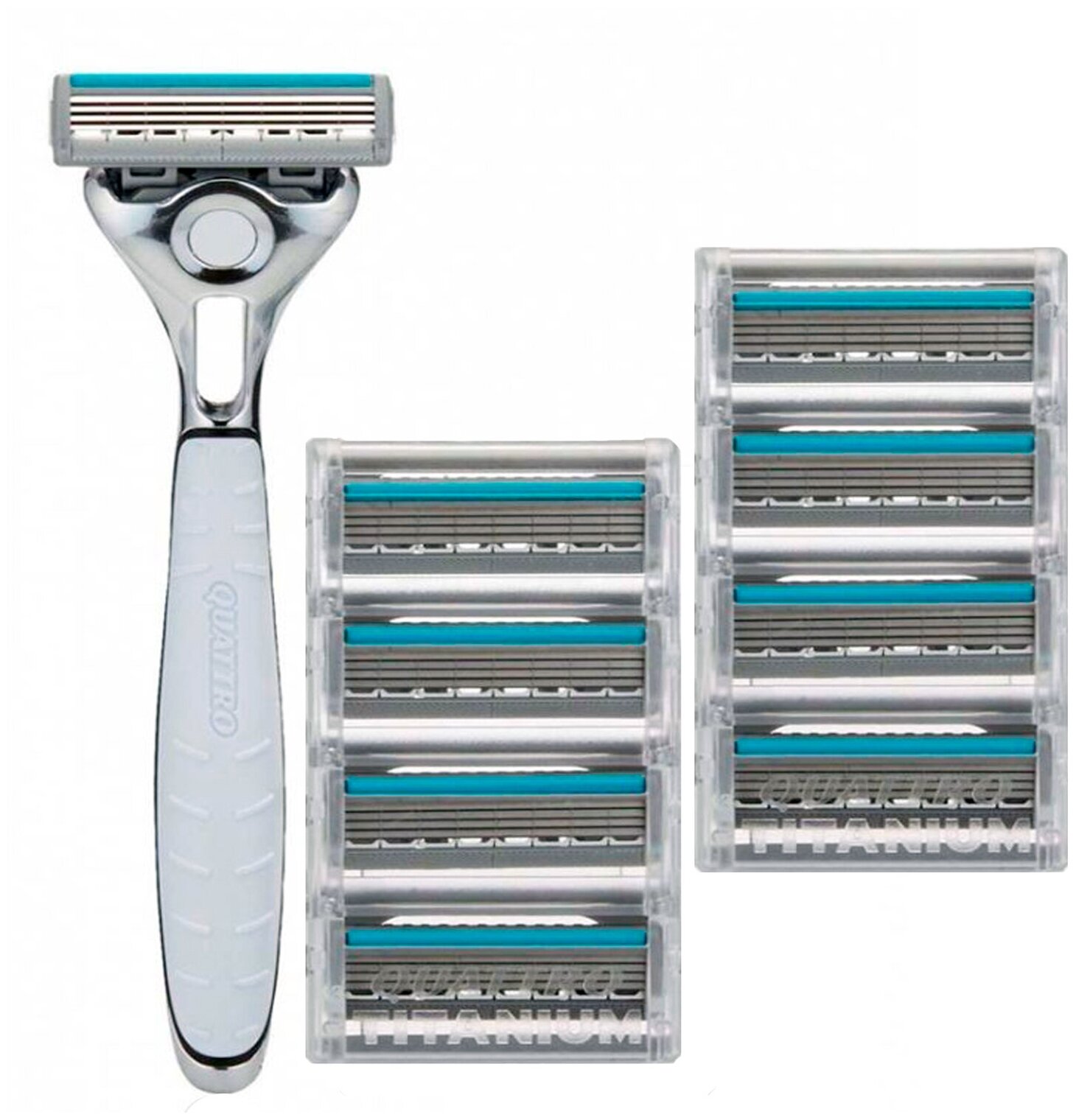 | Комплектация | Набор содержит 1 бритвенный станок Quattro и 9 сменных кассет Quattro Titanium Sensitive. Внимание: количество сменных кассет указано с учетом установленной на ручку станка. |