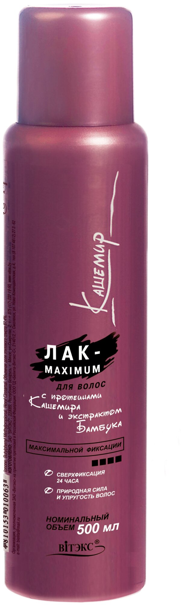 Лак для волос Белита-Витекс "Maximum", с протеинами кашемира и экстрактом бамбука, максимальная фиксация, без распылителя, 500 мл