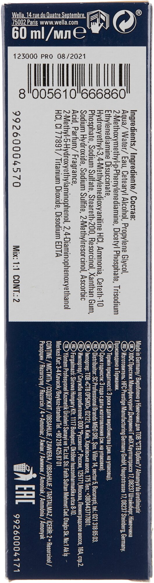 | Способ применения | приготовление смеси: смешайте краску с окислителем Welloxon Perfect в пропорции 1:1. окрашивание всех волос: намочите волосы; Распределите краску на волосах и равномерно прочешите. Время выдержки с теплом 15 минут; без тепла 20 минут. окрашивание отросших корней: нанесите красящую смесь только на прикорневую часть; с теплом на 15 минут, без тепла 20 минут. осветление: нанести красящую смесь только по длине волос и концы; с теплом 10 минут, без тепла 20 минут. Или нанести на прикорневую часть; с теплом 15-25 минут, без тепла 30-40 минут. По истечении времени тщательно смойте остатки краски водой, применяя шампунь Wella для окрашенных волос |