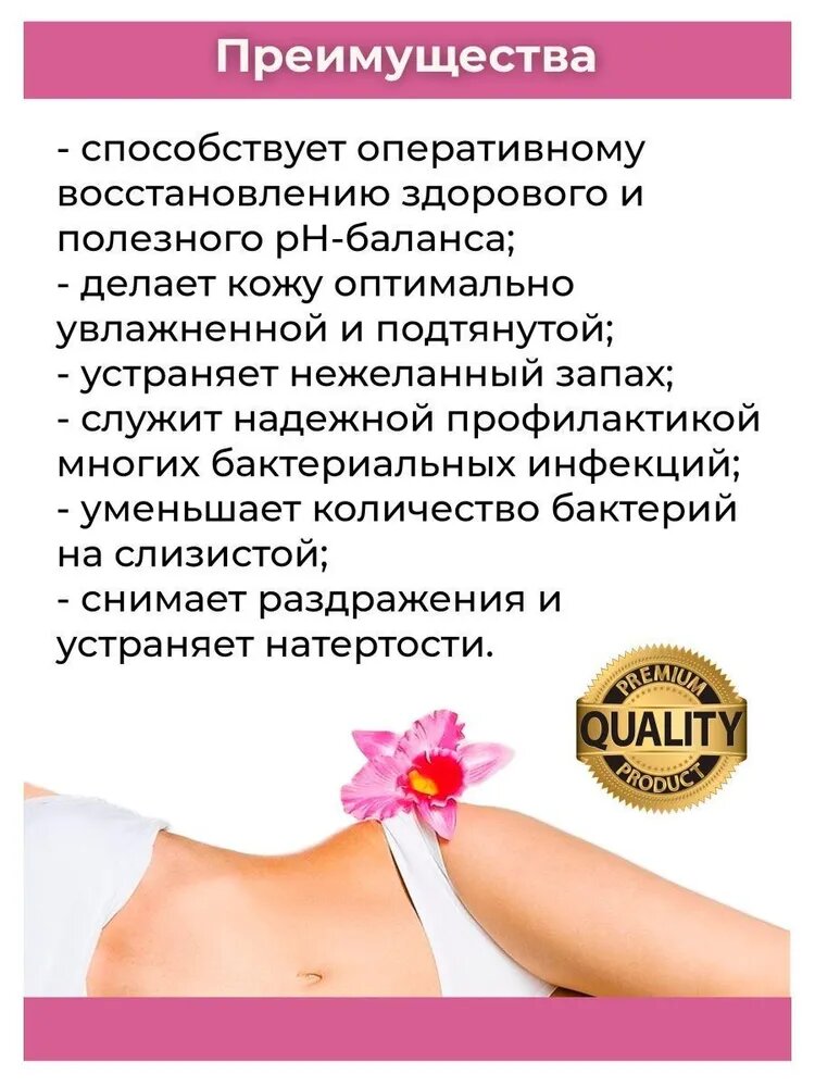 | Дополнительная информация | Налить небольшое количество геля на ладонь, вспенить и использовать для интимной гигиены. Тщательно смыть. Подходит для ежедневного ухода. |