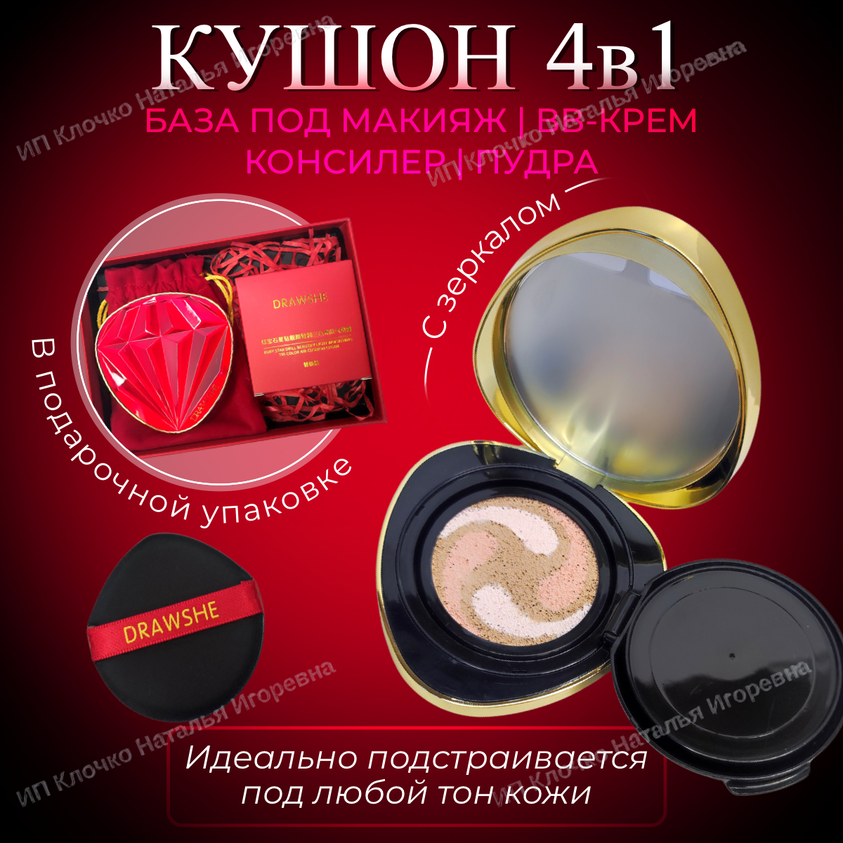 Бриллиантовый крем-кушон для лица DRAWSHE 4 в 1 в подарочном комплекте, красный информация: