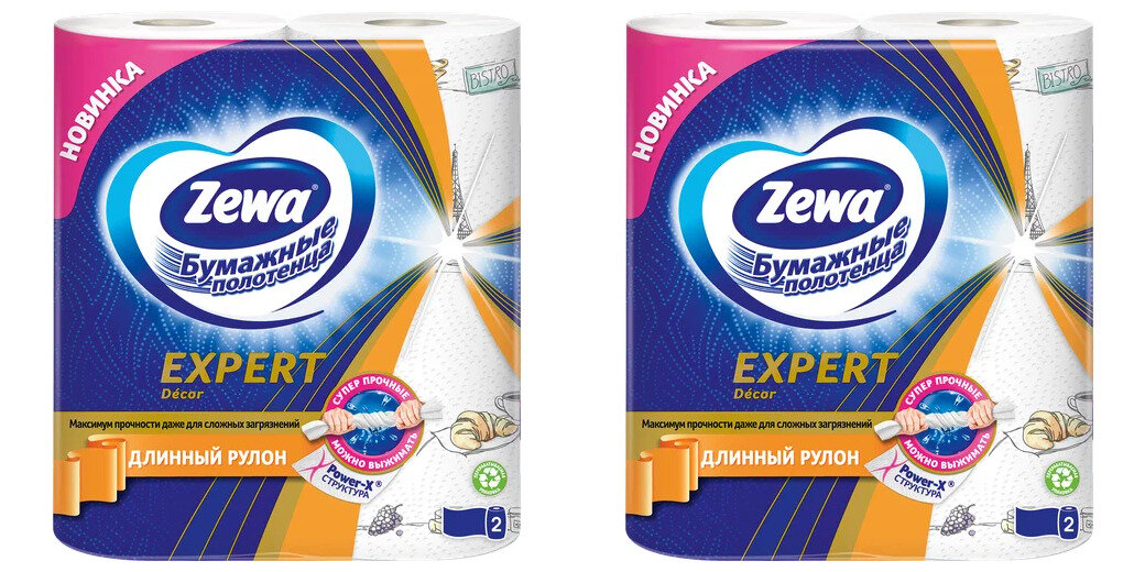 Полотенца бумажные Zewa, Expert Декор трехслойные 2 рул. в уп, 2 упаковки информация: