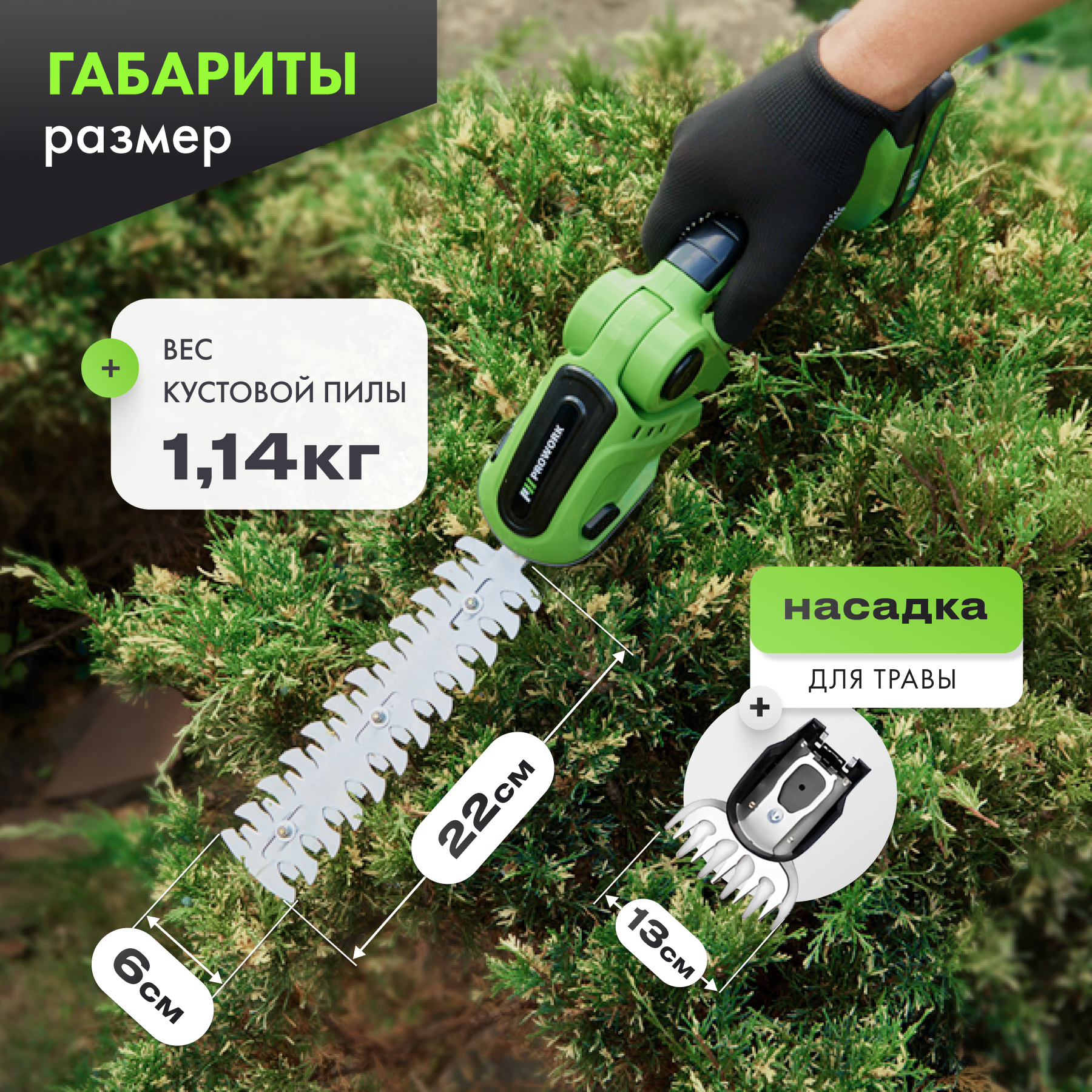 Садовый кусторез аккумуляторный/ аккумуляторные ножницы садовые/кусторез электрический/Мощный триммер для травы PROWORK/перчатки/ 2 насадки для кусов и травы информация: