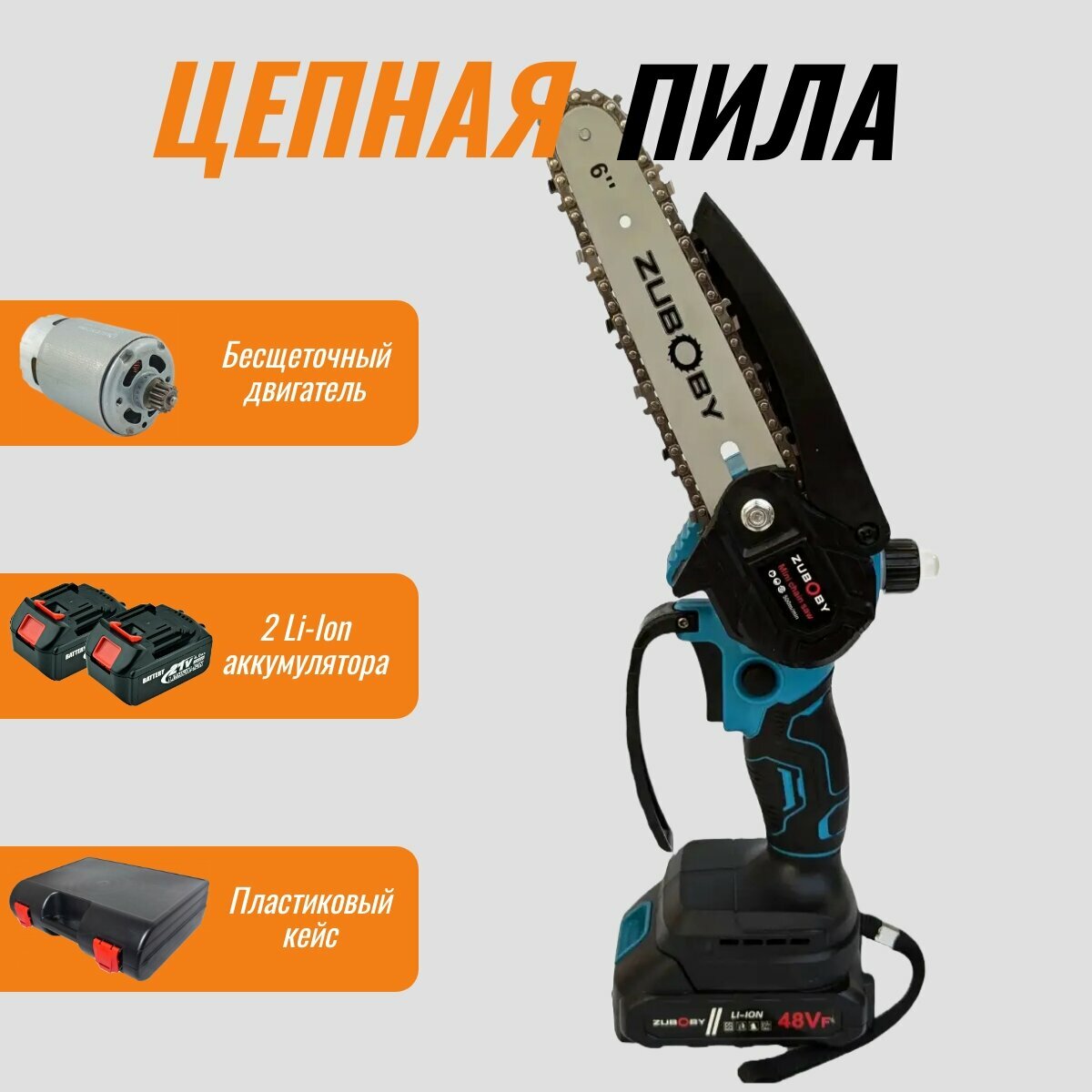 Аккумуляторная мини-пила (бесщеточный двигатель, 2 акк. 21В, 1,5Ач Li-Ion, шина 6", праймер смазки цепи, подсветка, кейс). 3 900 ₽