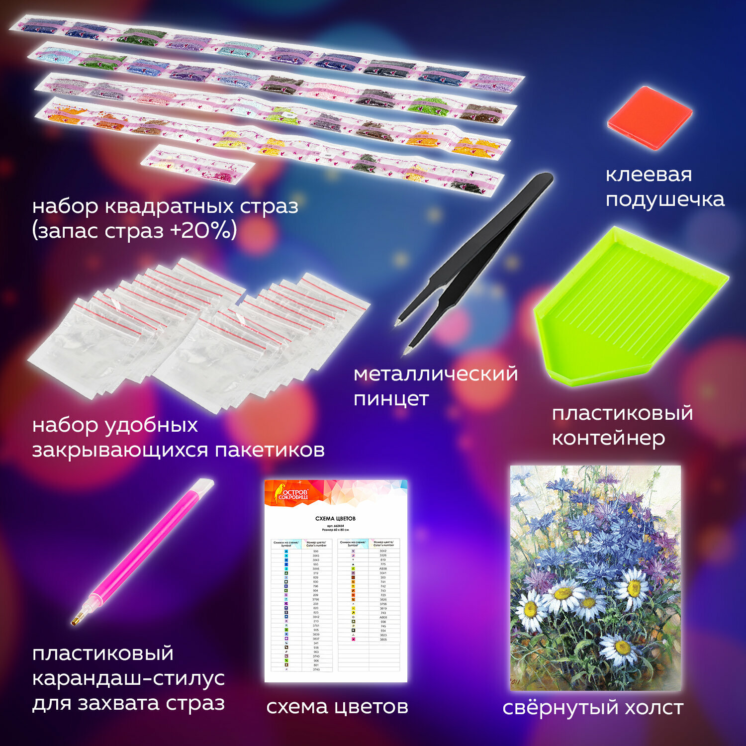 | Особенности | лоток для страз / пинцет / подрамник / с цифрами / стилус / холст / цветная схема / ювелирная огранка |