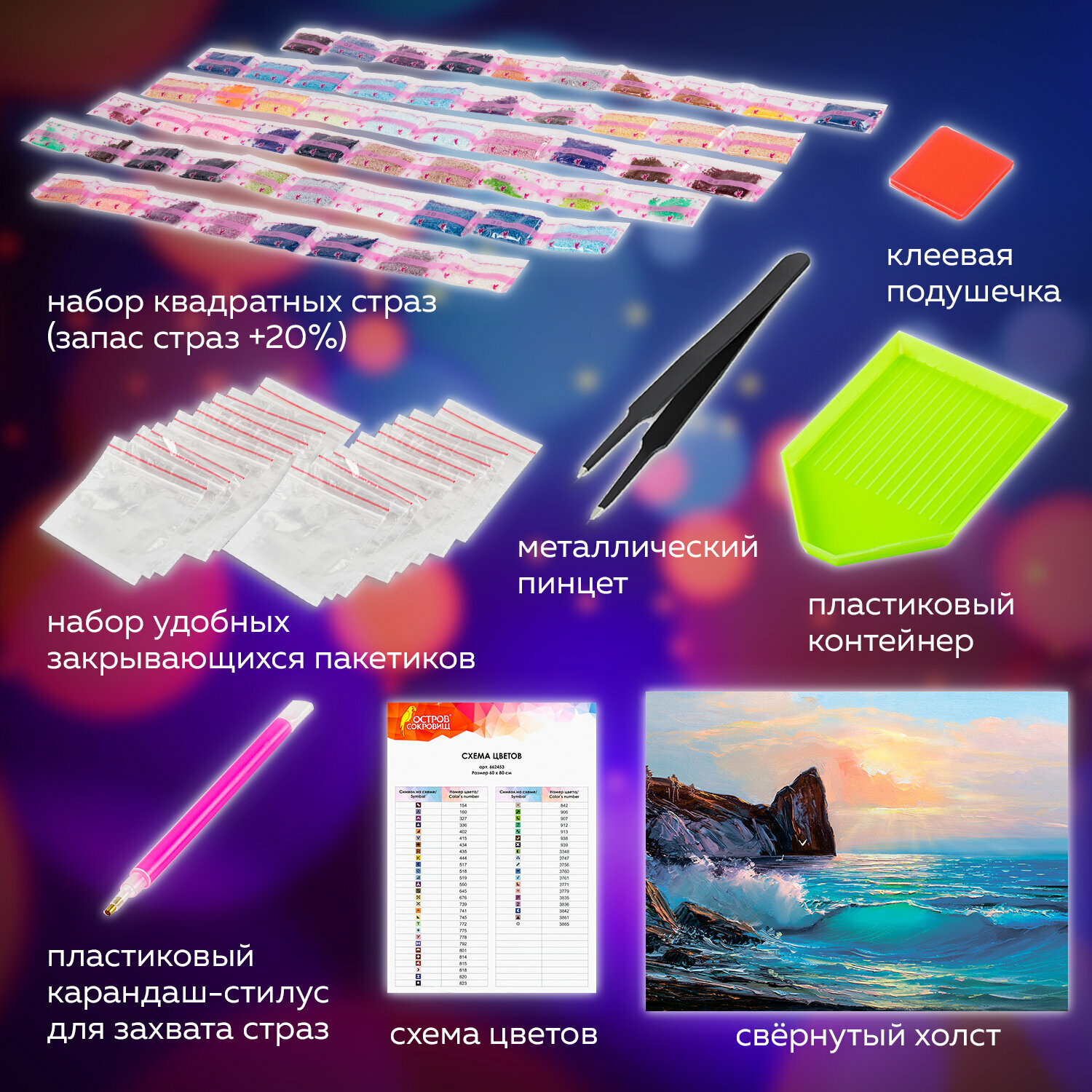 | Особенности | лоток для страз / пинцет / подрамник / с цифрами / стилус / холст / цветная схема / ювелирная огранка |