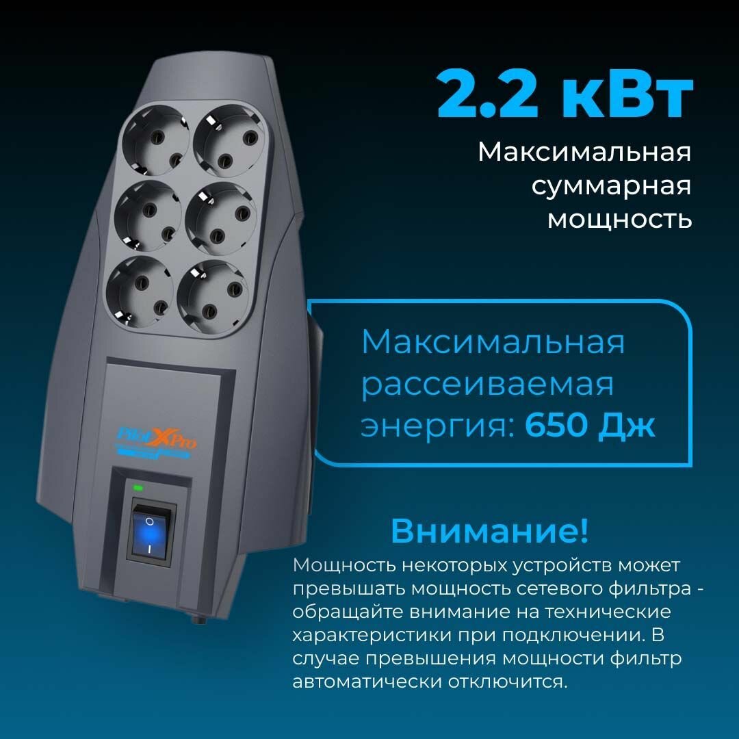 Сетевой фильтр Pilot X-Pro 1.8 м, 6 розеток, Zero Start биметаллический предохранитель, микропроцессор