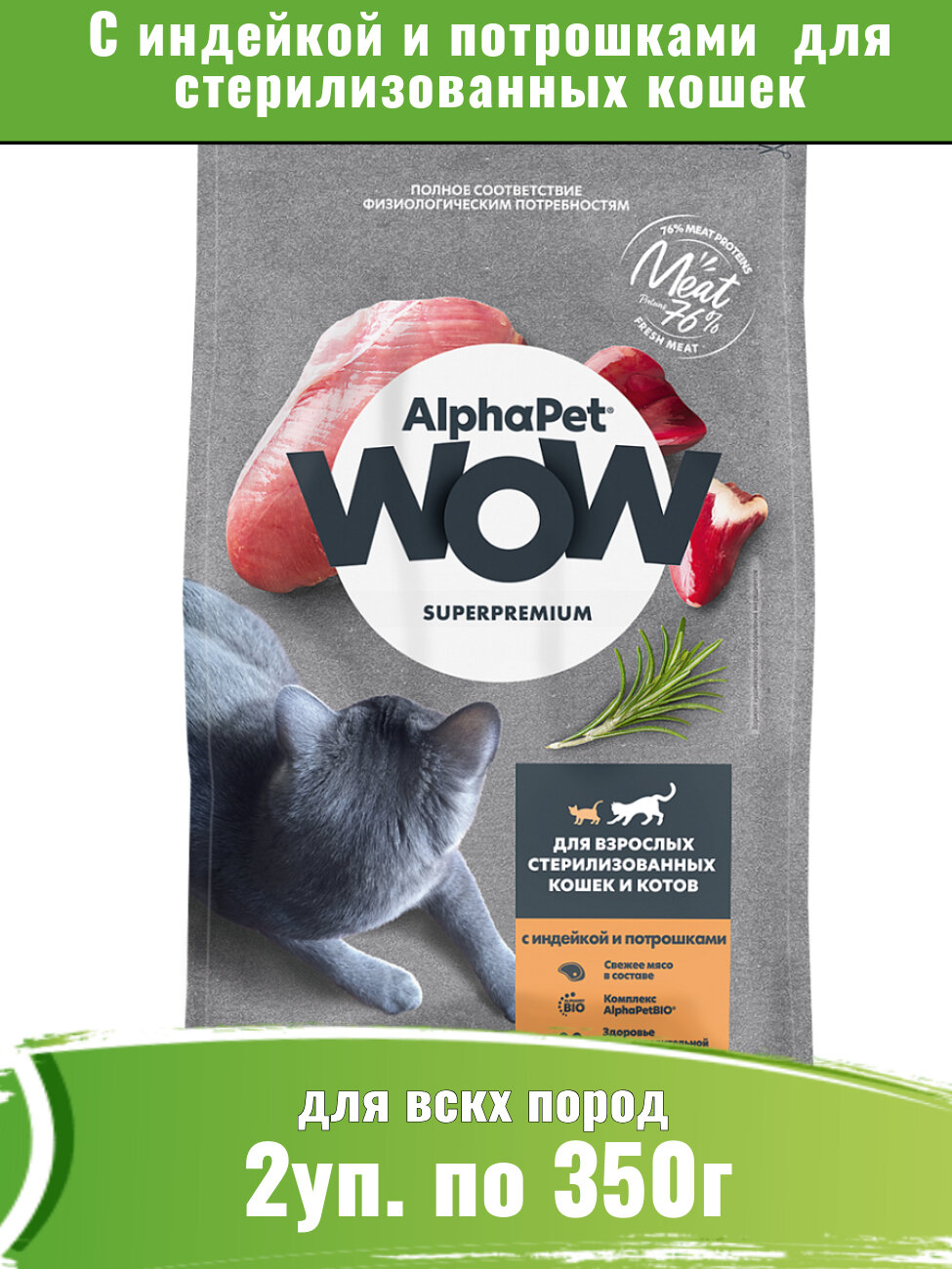 AlphaPet WOW корм сухой для стерилизованных кошек с индейкой и потрошками 2уп по 350г информация: