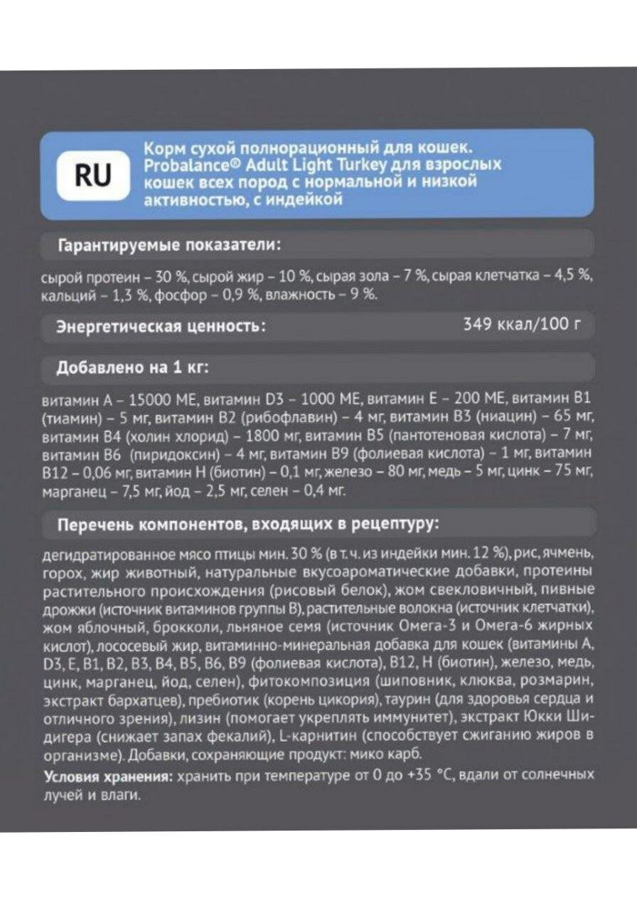 Корм сухой ProBalance Adult Light Turkey, для кошек с нормальной и низкой активностью, с индейкой 10 кг. информация: