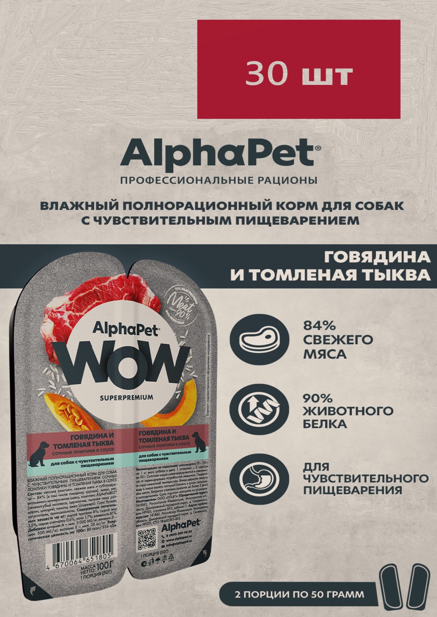 ALPHAPET WOW SUPERPREMIUM ламистер влажный корм для собак с чувствительным пищеварением говядина и томленая тыква 100г х 30шт информация: