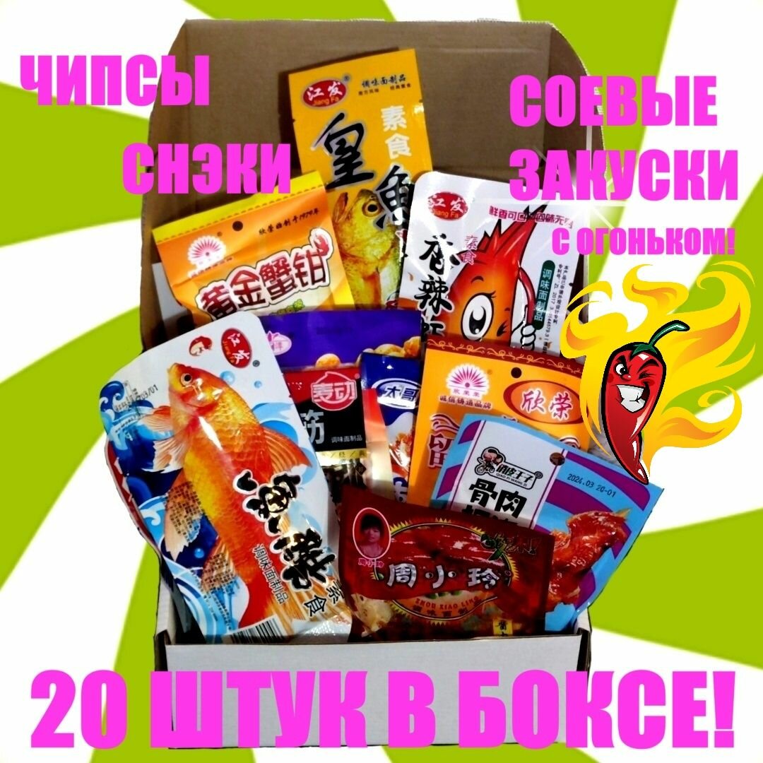 Отзывы на Острый бокс ASIAN BEER BOX 20 азиатских вкусняшек, соевое мясо, китайские чипсы и снэки к пиву / подарочный набор острых закусок / латяо