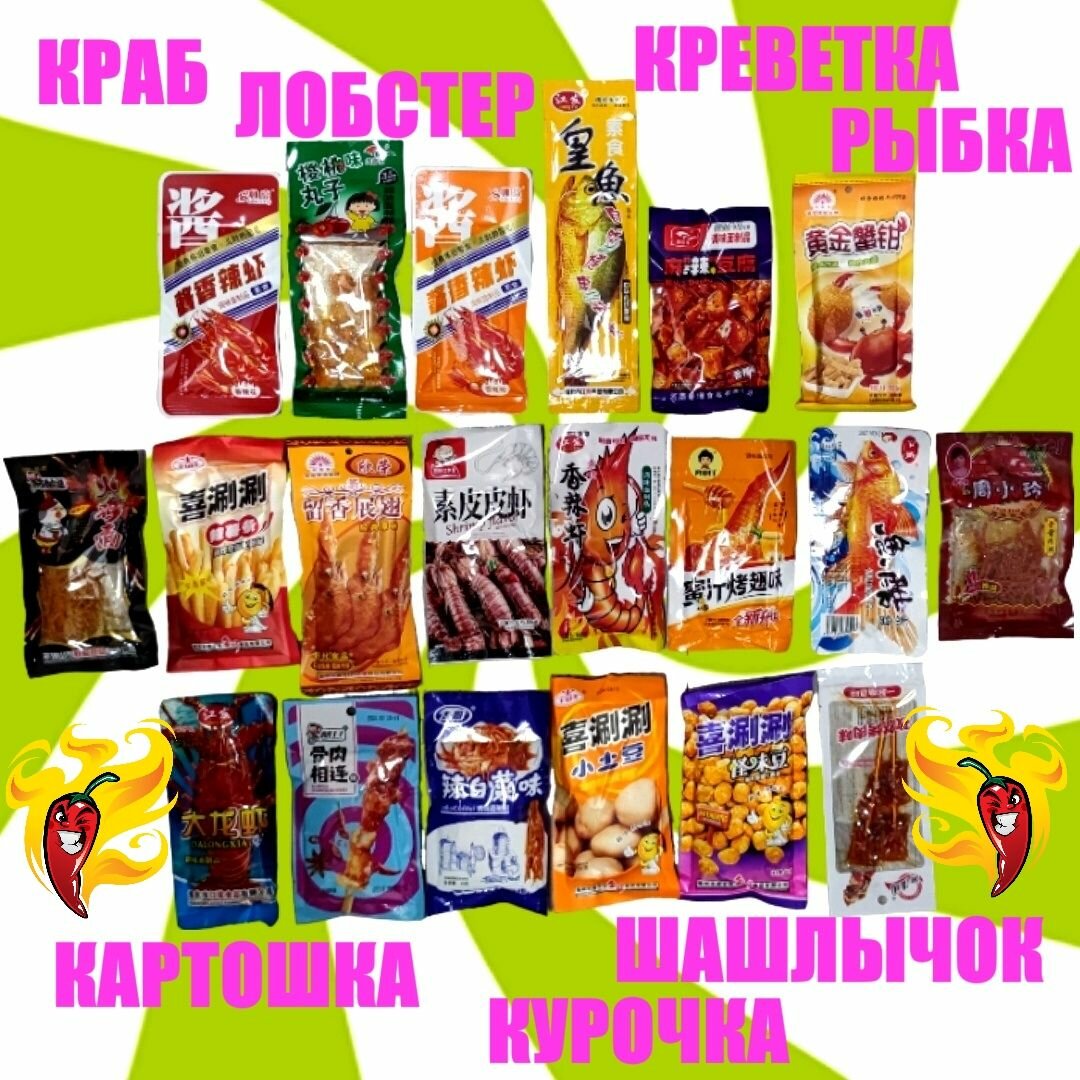 | Состав | Все наборы уникальны! Вы найдете в них: азиатский кебаб, острые шашлычки, острые соевые закуски, чипсы из батата, рисовые чипсы и другие азиатские снэки. |