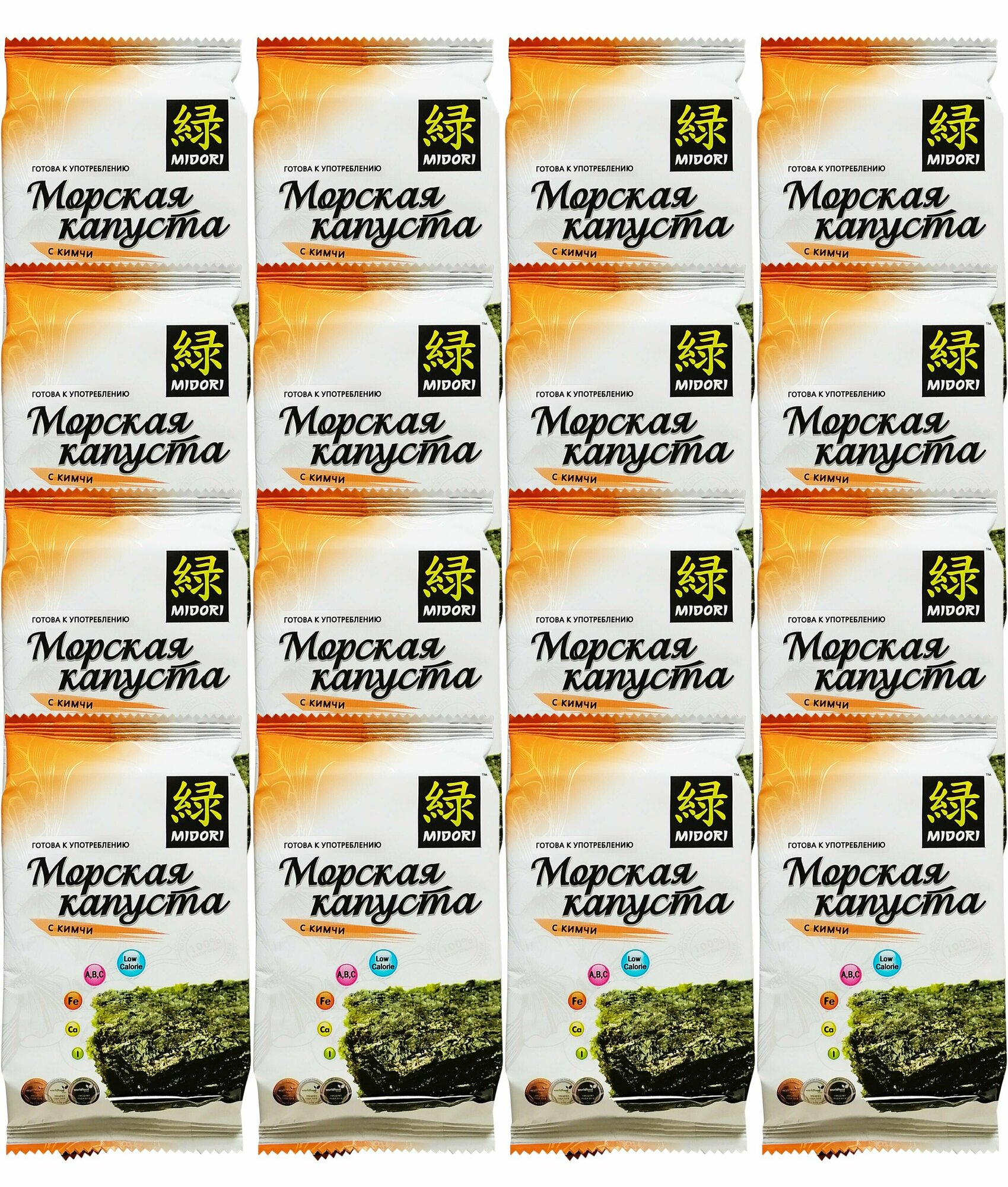 10 цен на Морская капуста обжаренная с кимчи Midori, водоросли нори (Корея), 5 г - 16 шт, натуральные чипсы, веган закуска