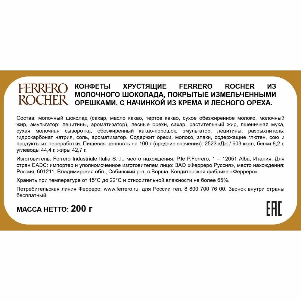 Конфеты шоколадные подарочные с орехом Ferrero Rocher 200 г 5 шт информация: