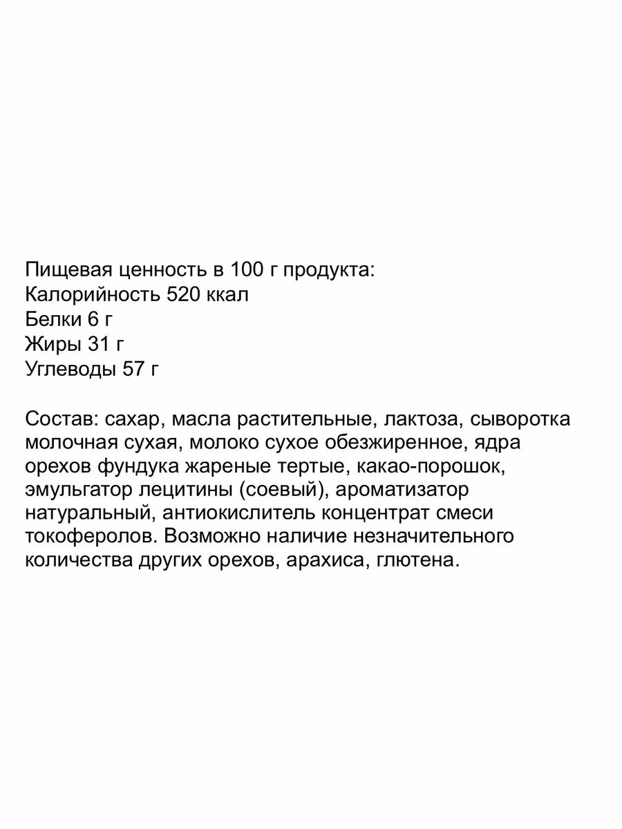 | Состав | сахар, жир пищевой общего назначения (рафинированные дезодорированные растительные масла, антиокислитель концентрат смеси токоферолов), лактоза, сыворотка молочная сухая, молоко сухое обезжиренное, ядра орехов фундука жареные тертые, какао-порошок, эмульгатор соевый лецитин, ароматизатор. Возможно наличие незначительного количества арахиса. |