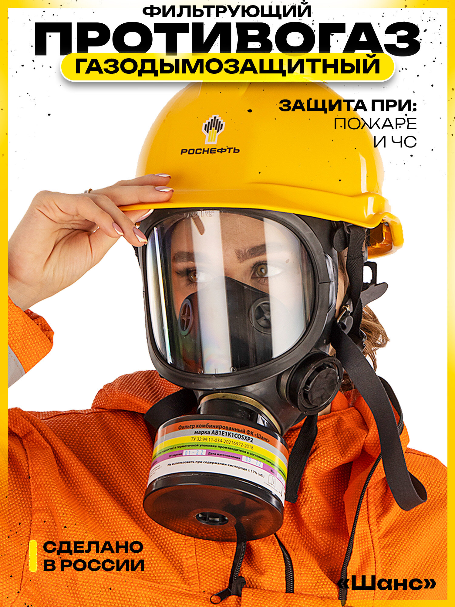 | Дополнительная информация | время защиты от продуктов горения не менее 60 мин; коэффициент проницаемости по аэрозолю, не более - 0,05%; масса фильтра «Шанс» - не более 390 г.; резьбовое соединение фильтра "Шанс" соответствует ГОСТ 8762 и позволяет его использовать с различными лицевыми частями, сохраняя герметичность; комплектность: промышленная панорамная маска (ППМ) - 1 шт.; фильтр комбинированный (ФК) «Шанс» (марки AB1E1K1COSXP2) ТУ 8027-034-09911217-2015 - 1 шт.; средство против запотевания стекла (гель) -1 шт.; руководство по эксплуатации и паспорт -1 шт.; сумка для ношения и хранения противогаза -1 шт. |