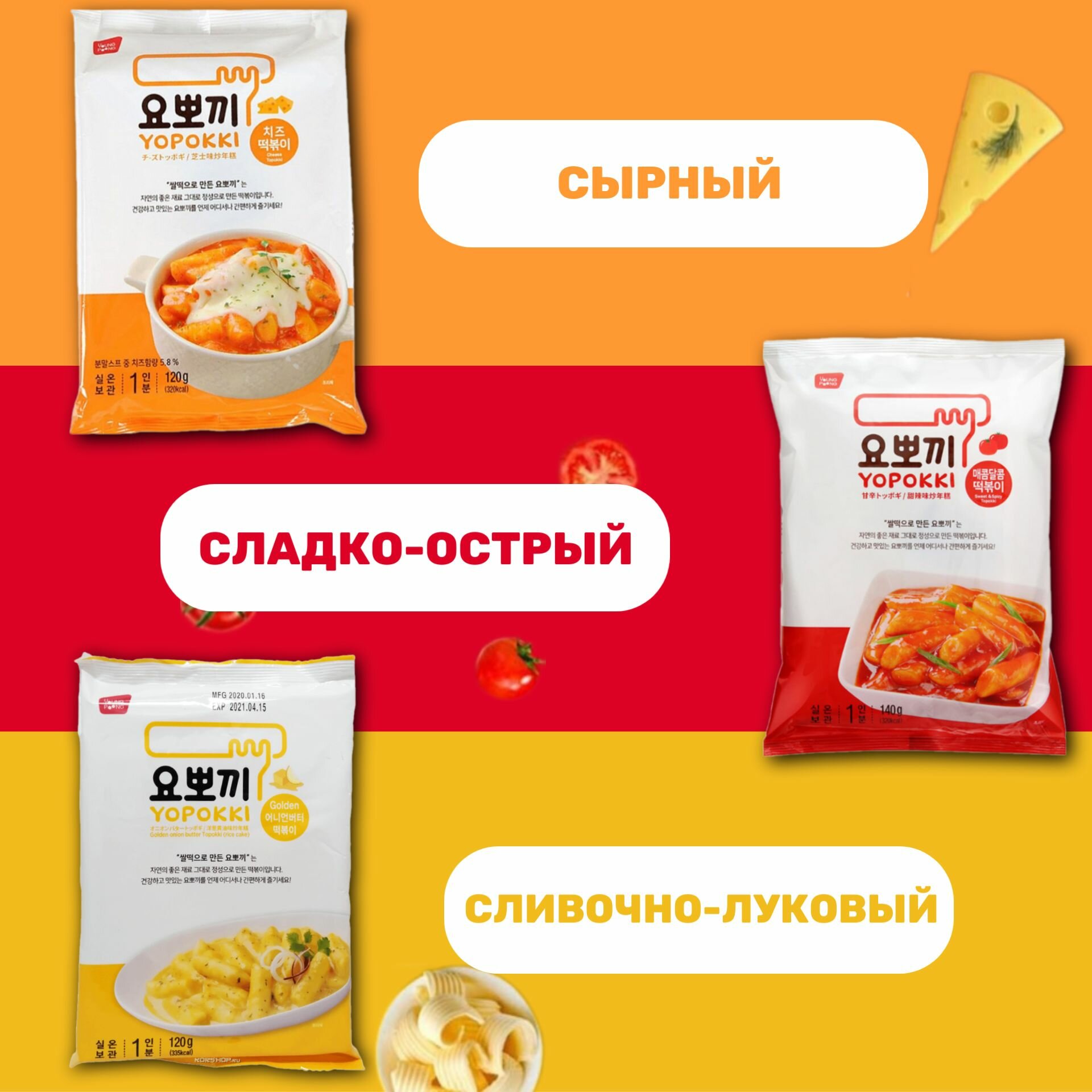 Рисовые палочки Топокки Сливочно-луковый, Сыр, Сладко-острый, (3шт*120гр) информация: