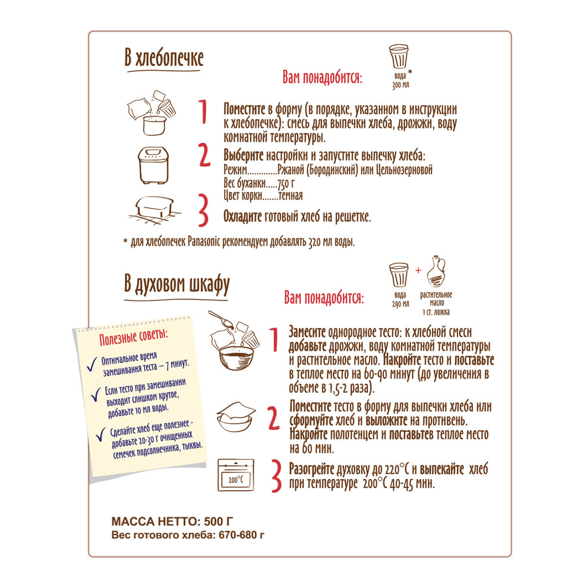 | Состав | мука пшеничная хлебопекарная первого сорта, мука ржаная хлебопекарная обдирная, овсяные хлопья, сахар белый, мука гречневая, семена льна, семена кунжута, солод ржаной ферментированный, мука кукурузная, мука рисовая, мука льняная, кориандр молотый, пищевая морская соль, пшеничная клейковина. Дрожжи хлебопекарные сухие - в отдельном пакетике. Может содержать следы сои, орехов, арахиса, кунжута, сельдерея, горчицы. |