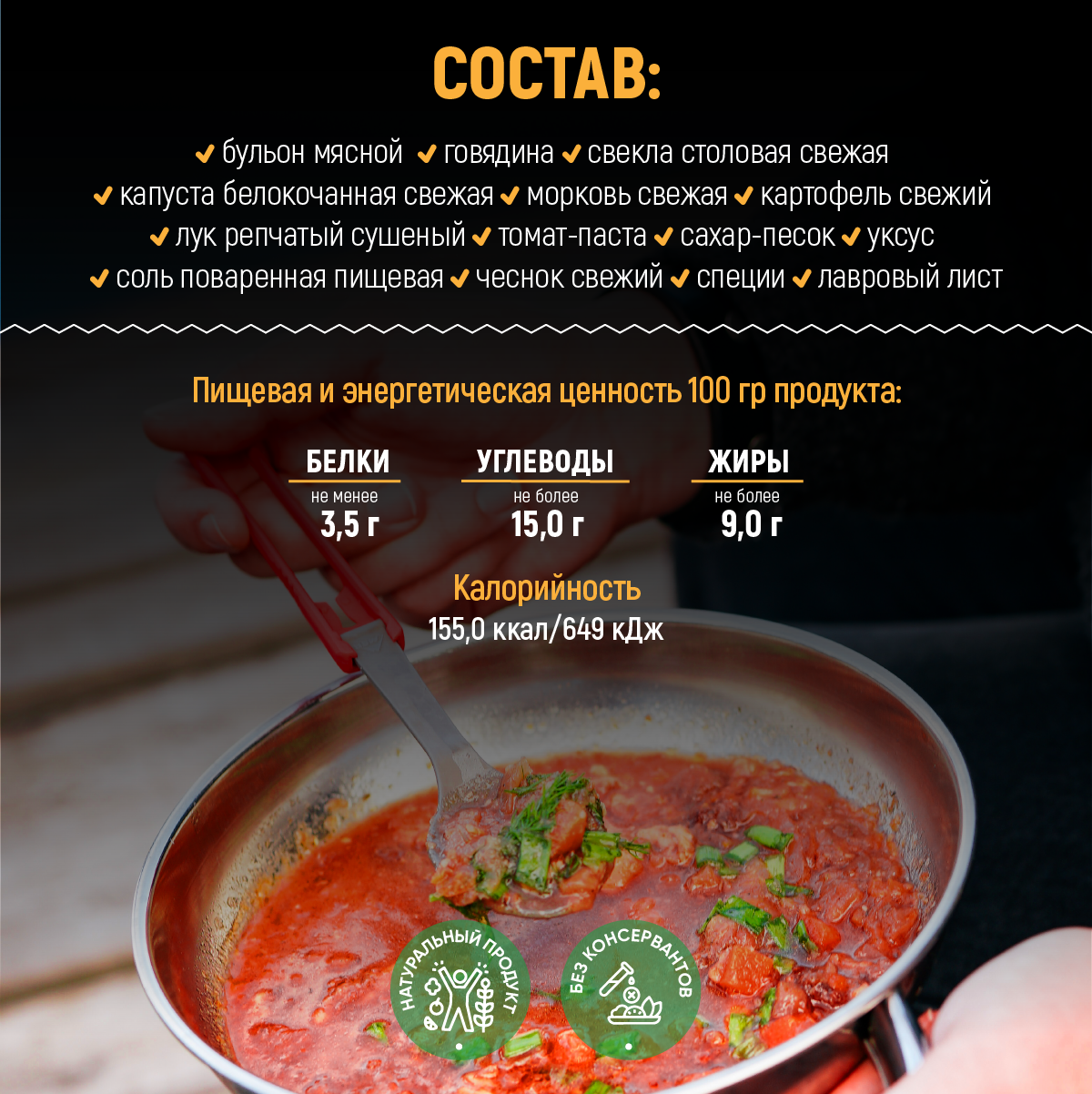 | Состав | говядина, картофель, лук репчатый, лавровый лист, чеснок свежий, соль поваренная пищевая, морковь свежая, свекла столовая, капуста белокочанная свежая, томат-паста |