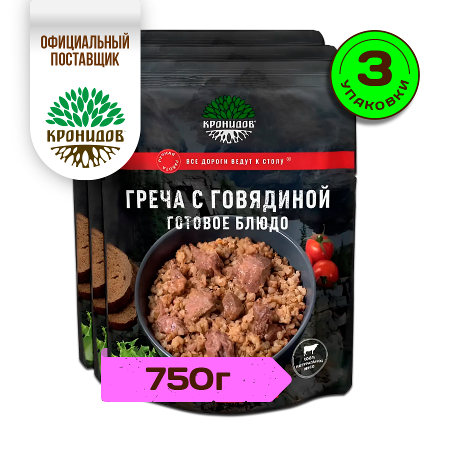 10 цен на Греча с говядиной Готовое блюдо в реторт-пакете ТМ Кронидов. Консерва Набор 3 шт. по 250 г