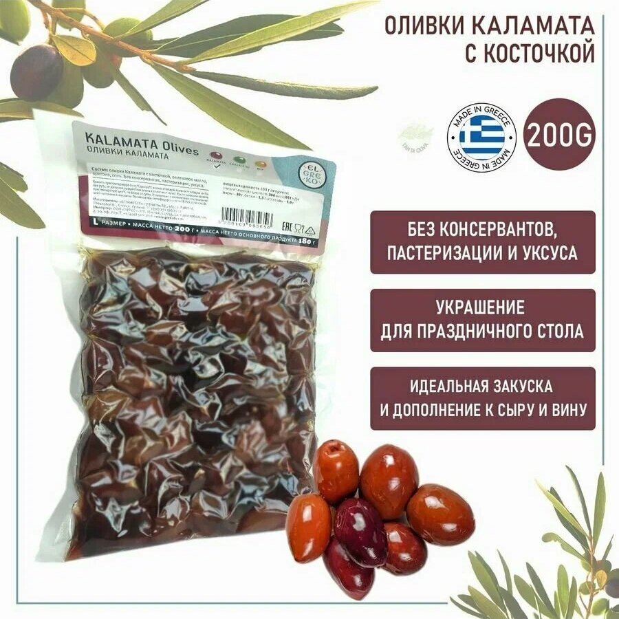 10 цен на Оливки Каламата с косточкой Греческие в вакуумной упаковке, El Greko Греция, 200 грамм