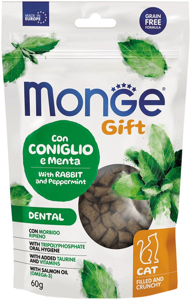 10 цен на MONGE Gift Dental Лакомство Хрустящие подушечки кролик,перечная мята д/чистки зубов д/кошек 60г