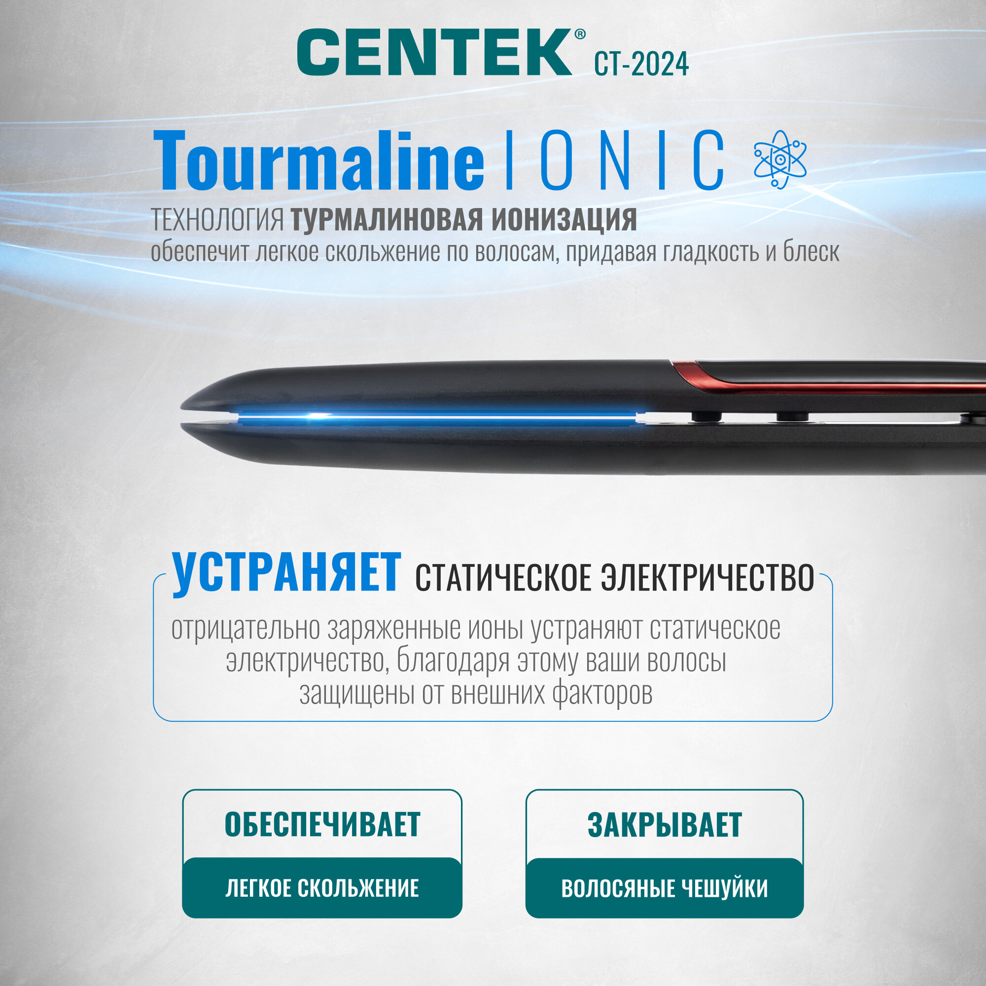 Выпрямитель для волос CENTEK CT-2024/ 35 Вт/ 4 режима/ LED дисплей/ керамические пластины 110х24мм, турмалиновая ионизация информация: