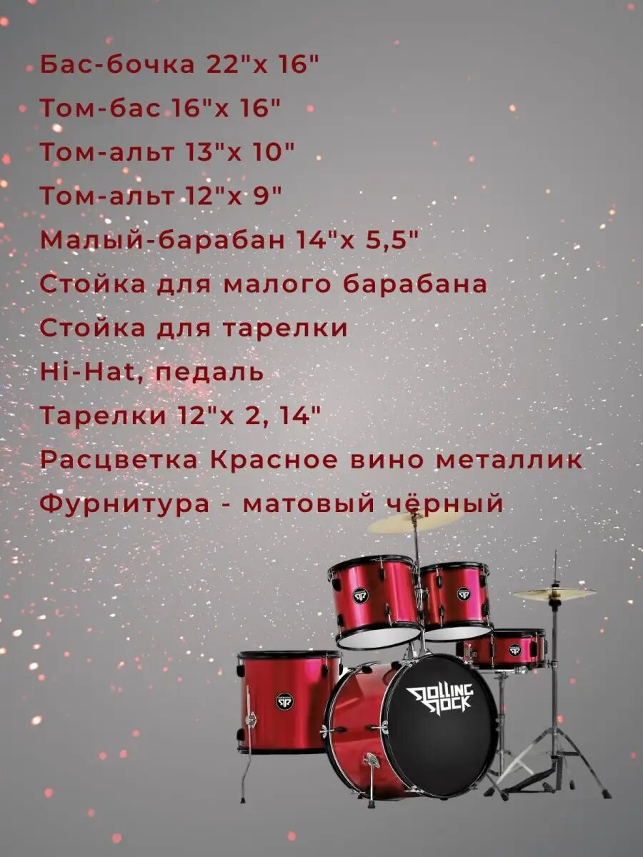 | Подробная комплектация | Барабаны: Бас-бочка 22"х16 Том-бас 16x16" Том-альт 13x10" Том-альт 12x9" Малый-барабан 14x 5,5". Стойки для малого барабана, Hi-Hat, педаль, Тарелки: 12х2, 14х1 |