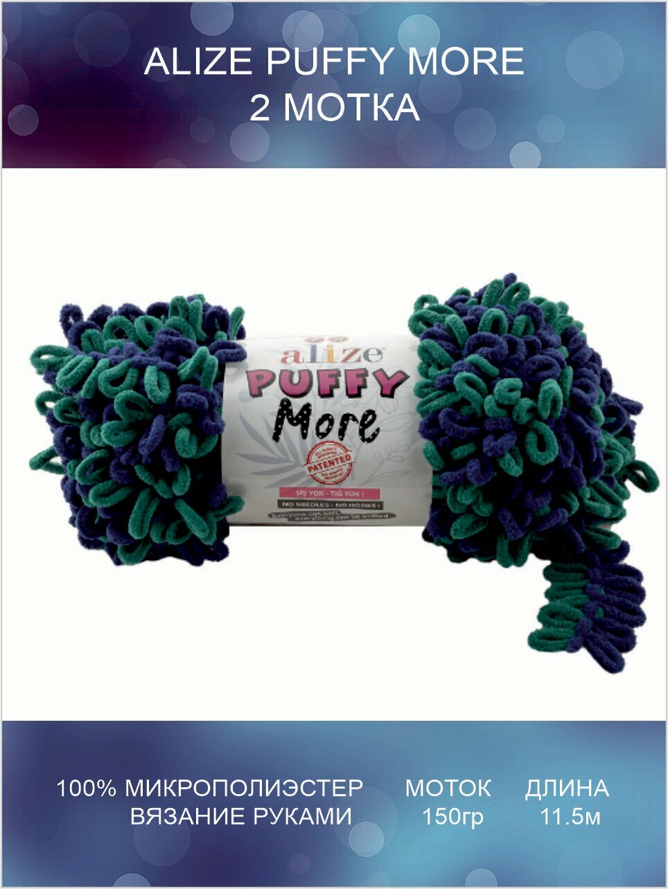 Пряжа Puffy MORE (Alize), зеленый/синий - 6293, 100% микрополиэстер, 2 мотка, 150 г., 11,5 м. информация: