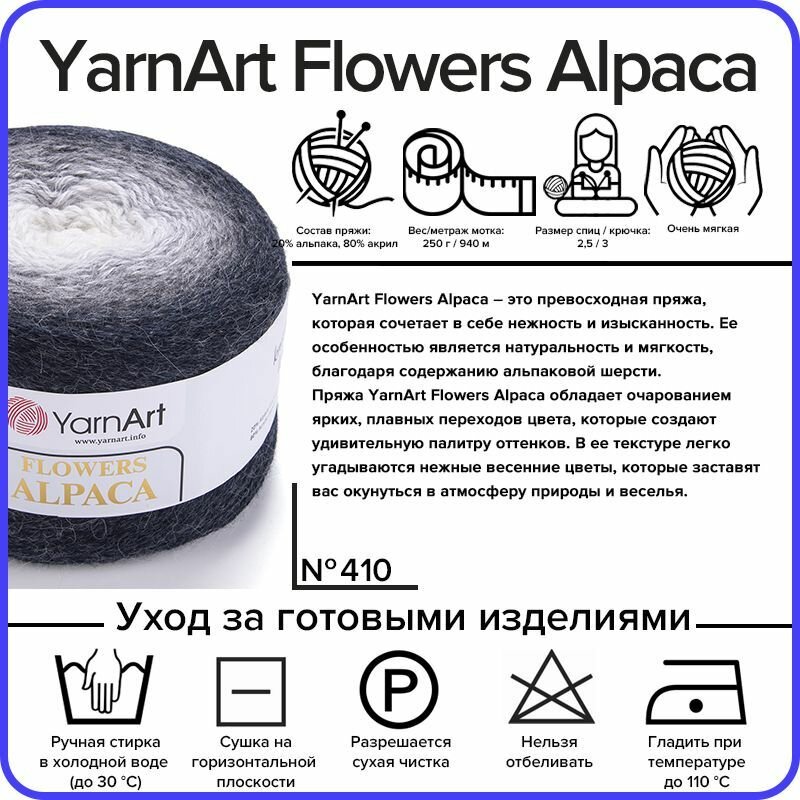 Пряжа YarnArt Flowers Alpaca (ЯрнАрт Фловерс Альпака) Нитки для вязания, 250г, 940м, 20% альпака, 80% акрил, цвет 410 т.маренго-серый-белый, 2шт информация:
