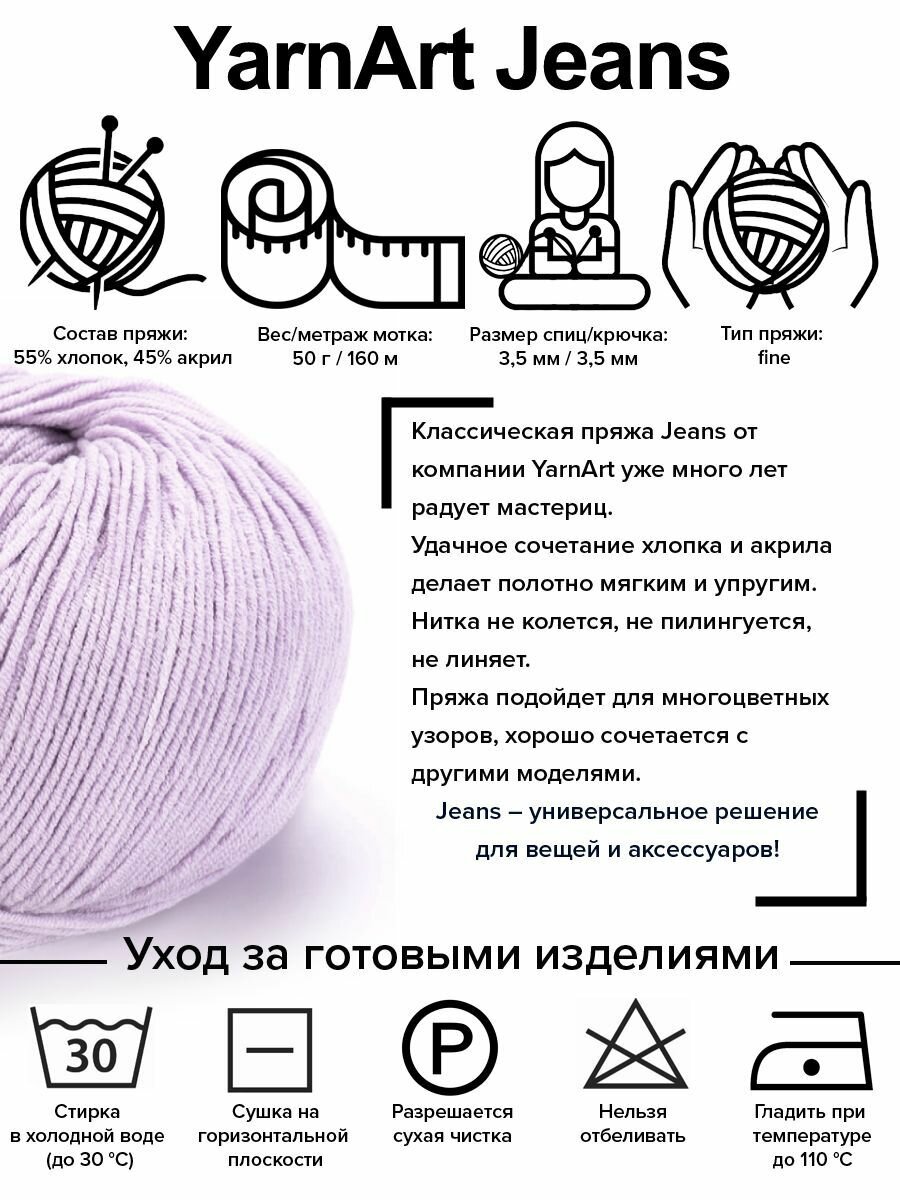 Пряжа YarnArt Jeans, 55 % хлопок, 45 % акрил, 50 г, 160 м, 1 шт, 19 сиреневый