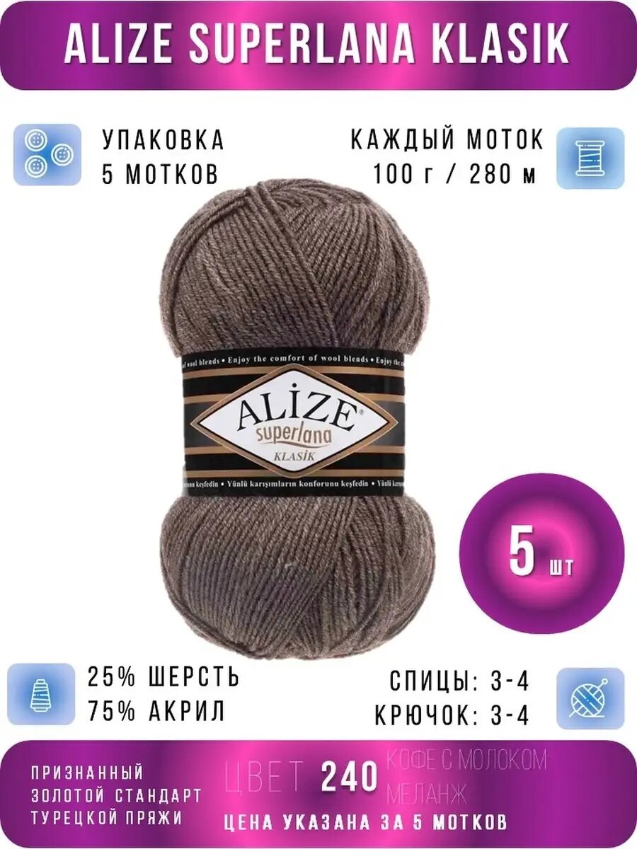 10 цен на Пряжа для вязания ALIZE 'Superlana klasik', 100г, 280м (акрил, шерсть), ТУ (240 кофе с молоком меланж), 5 мотков