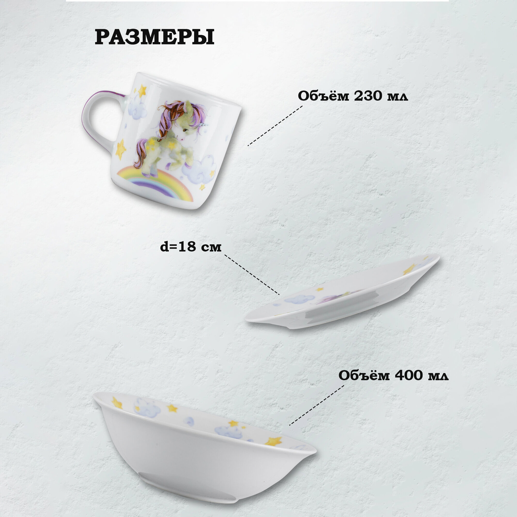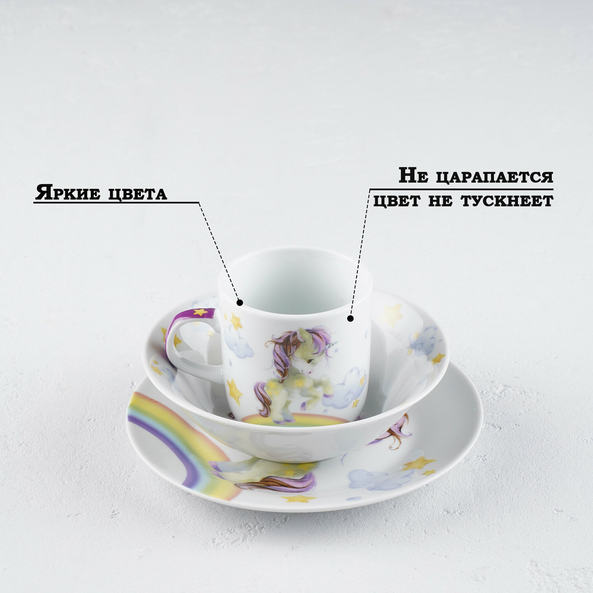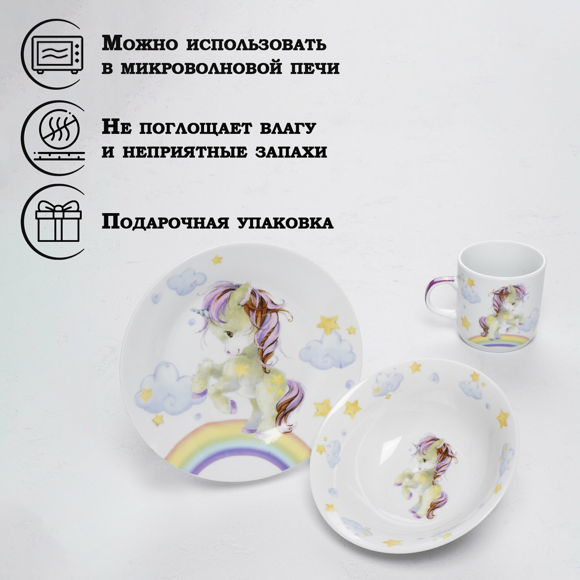 Набор детской посуды из керамики Доляна «Единорог», 3 предмета: кружка 230 мл, миска 400 мл, тарелка d=18 см