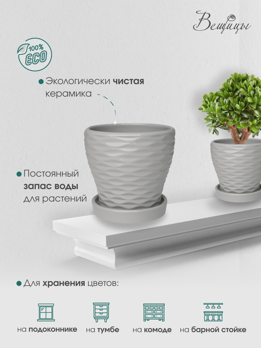 Горшок ВеЩицы для цветов с литым поддоном / Керамический цветочный горшок 11х11х10,5 см, 0,55 литра серый информация: