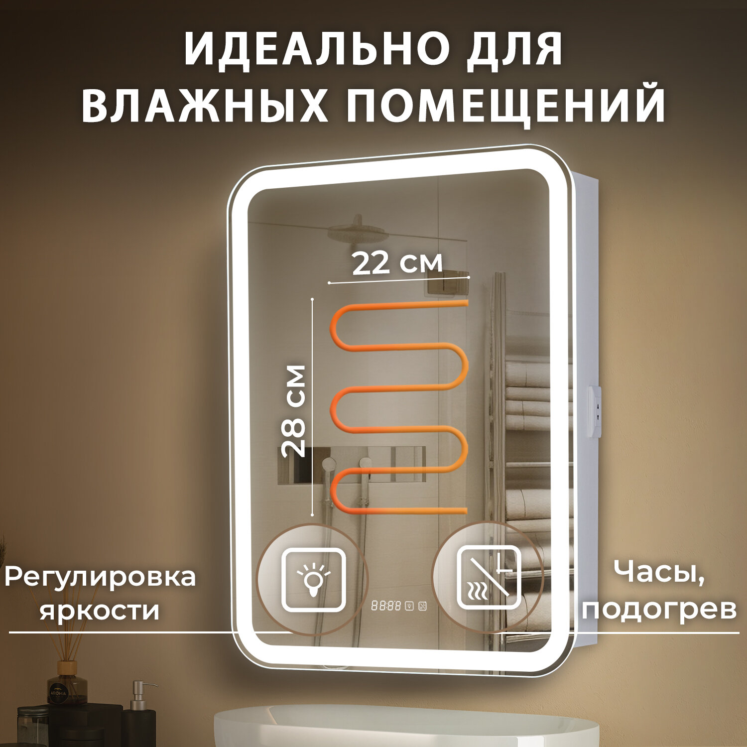 Зеркало в ванную со шкафчиком, 60х80 (с подогревом,холодная LED подсветка, влагозащита, зеркало настенное с розеткой, сенсорное управление, зеркало в ванную с подсветкой 6000К) 13 243 ₽