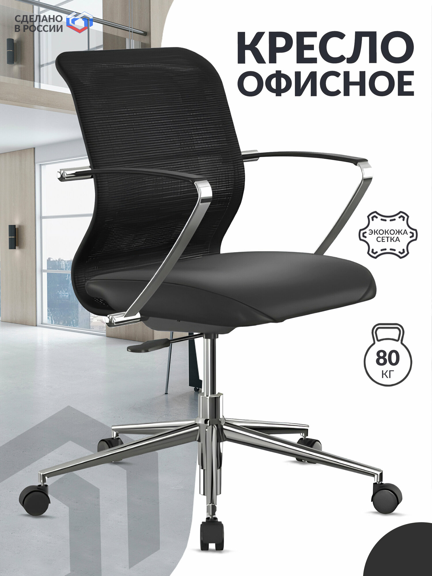 Кресло компьютерное офисное для посетителей Метта ErgoLife Sit 8 M4 9K на колесиках, с подлокотниками, низкой спинкой, экокожа, черное, для оператора, клиентское, рабочее ортопедическое информация: