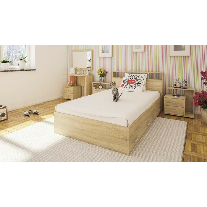 Кровать с ящиками Камелия 1200, цвет дуб сонома, ШхГхВ 123,5х217х78,2 см, спальное место 1200х2000 мм, без матраса, основание есть