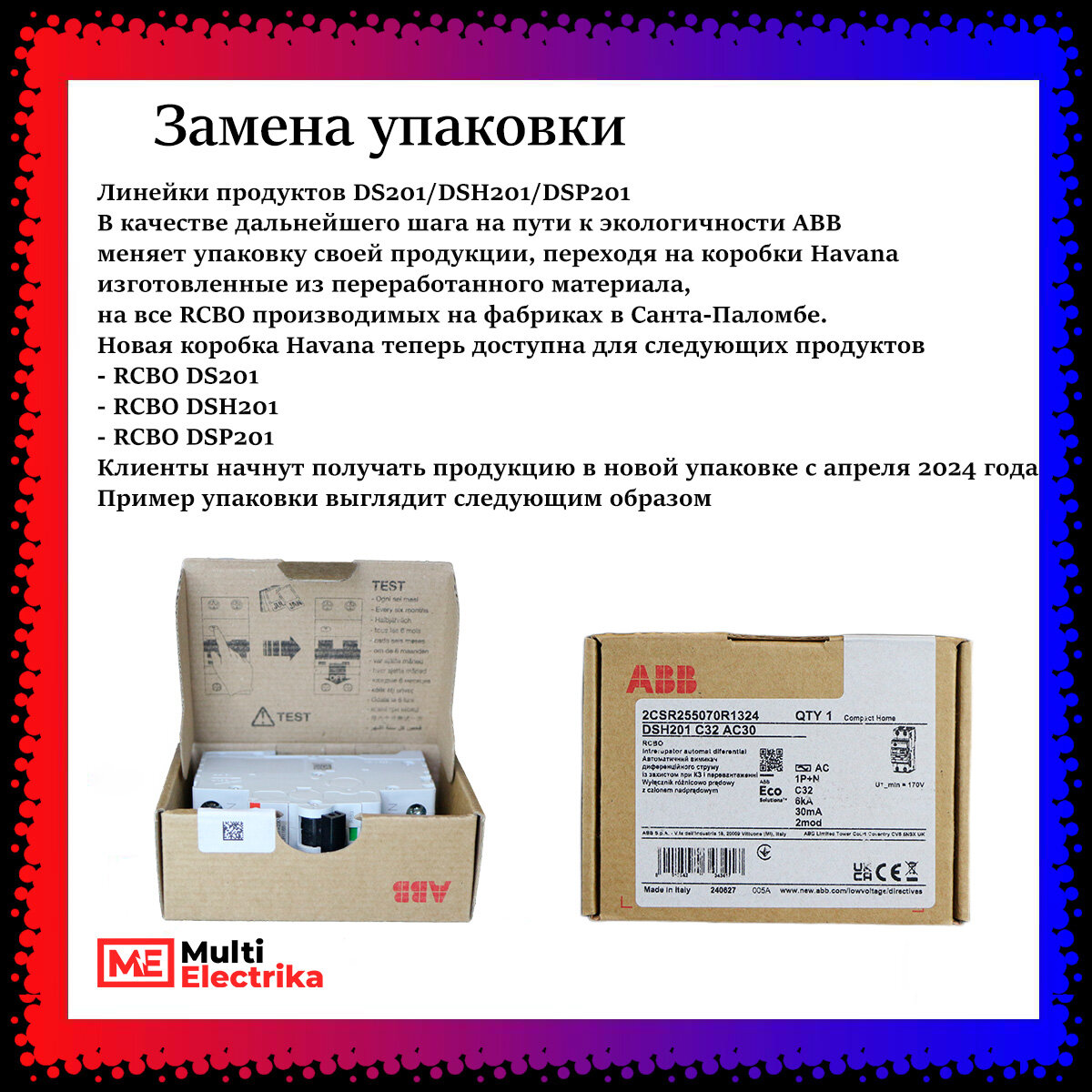 Дифференциальный автомат ABB 1P+N DSH201 C32 AC30 2CSR255070R1324 информация: