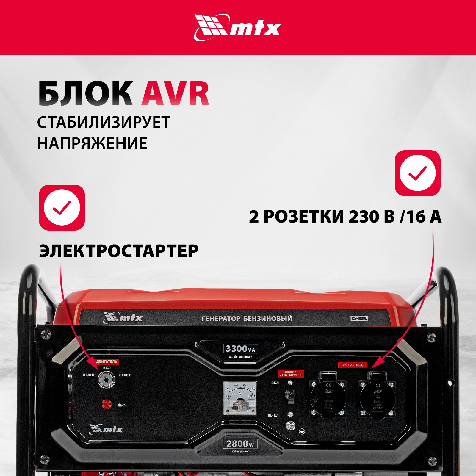 10 цен на Генератор бензиновый MTX RS-4000E, 3,3 кВт, 230В, электростартер 946125