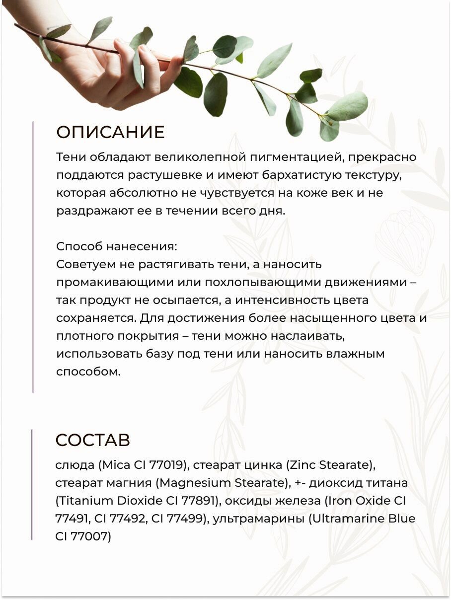| Способ применения | для нанесения теней используйте плоскую кисть с искусственным, наборным ворсом. Одним мягким прикосновением набираем тени на кисть и частыми протягивающими (1-3 мм) движениями наносим продукт на веко. Тени можно наслаивать для достижения наиболее более плотного покрытия или наносить влажным способом. Для более стойкого эффекта – используйте базу под тени или любые кремовые текстуры |