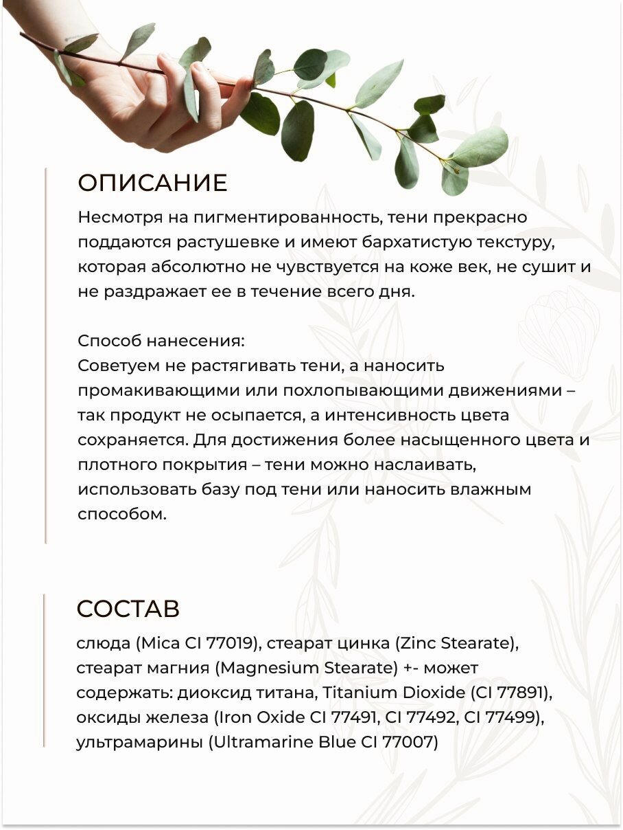 | Способ применения | для нанесения теней используйте плоскую кисть с искусственным, наборным ворсом. Одним мягким прикосновением набираем тени на кисть и частыми протягивающими (1-3 мм) движениями наносим продукт на веко. Тени можно наслаивать для достижения наиболее более плотного покрытия или наносить влажным способом. Для более стойкого эффекта – используйте базу под тени или любые кремовые текстуры |