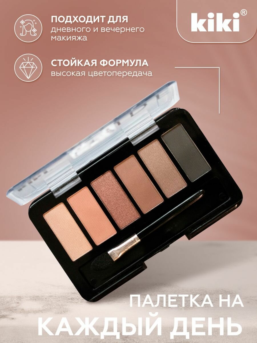 Тени для век kiki shadow NUDE, тон 905 натуральный шик, 6 оттенков, палетка с кистью для растушевки, стойкие, матовые, нюдовые, перламутр 283 ₽