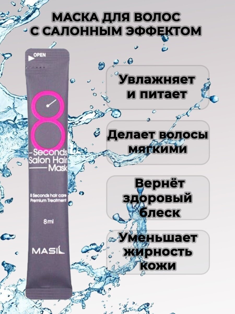 Masil Маска для волос салонный эффект за 8 секунд, Маска филлер для волос увлажняющая профессиональная 8 секунд масил, набор саше 10штх8мл Корея 470 ₽