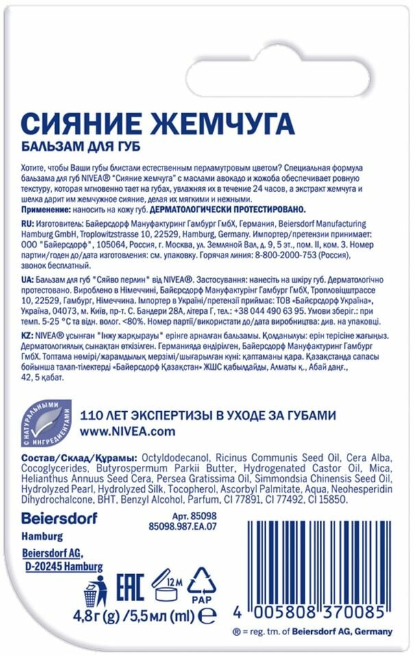 Nivea Бальзам для губ Сияние жемчуга, 4.8 г, 3 шт информация: